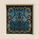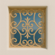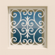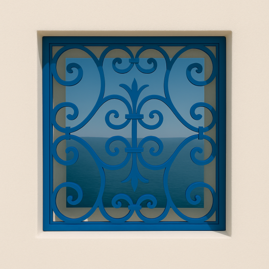 Κομψό κάγκελο ασφαλείας παραθύρου με περίτεχνα καμπύλα μοτίβα και διακοσμητικό ανθέμιο στο κέντρο, εμπνευσμένο από την παραδοσιακή βενετσιάνικη σφυρηλάτηση και τη μεσογειακή αισθητική.