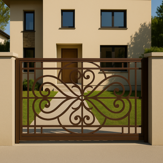 Η αυλόπορτα Ornamental Flow συνδυάζει παραδοσιακή φινέτσα με σύγχρονη μεταλλική ακρίβεια. Το περίτεχνο συμμετρικό μοτίβο θυμίζει χειροποίητη σφυρηλάτηση, αποπνέοντας αρχοντιά και κομψότητα. Κατάλληλη για κατοικίες υψηλής αισθητικής ή παραδοσιακά αρχοντικά, προσφέρει ταυτόχρονα ασφάλεια και διακριτικό μεγαλείο. Διατίθεται σε διάφορα χρώματα RAL κατόπιν παραγγελίας.