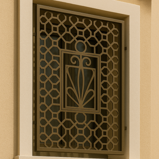 Κάγκελο ασφαλείας παραθύρου με μοναδικό γεωμετρικό μοτίβο εμπνευσμένο από παραδοσιακά αρχιτεκτονικά στοιχεία. Η σύνθεση περιλαμβάνει κεντρικά διακοσμητικά μοτίβα που παραπέμπουν σε στυλιζαρισμένα φύλλα ή ηλιαχτίδες, ενώ το πλαίσιο πλαισιώνεται από συμμετρικό πλέγμα, προσφέροντας κομψότητα και ασφάλεια.